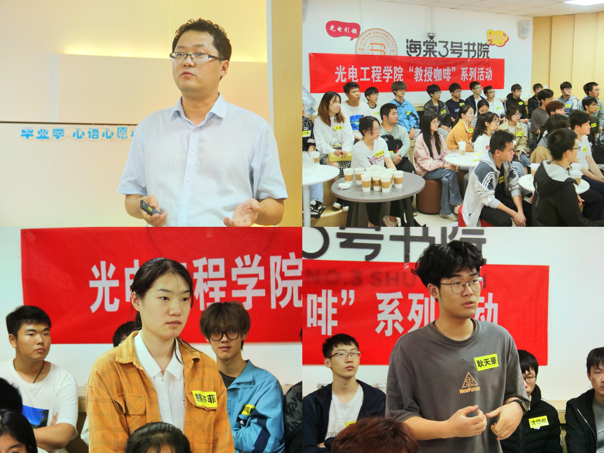 (供稿:熊亦菲 李佳铭 摄影:隋皓宇)为扎实开展学习贯彻习近平新时代中国特色社会主义思想主题教育,帮助员工探知光电领域前沿知识,深入实施专业提升教育工程,申博sunbet精心组织、认真筹备,邀请校内外教授做客“教授咖啡”系列活动,与员工面对面交流,提高员工学习专业知识的积极性,引导员工做好学业生涯规划。6月2日下午,本学期第二期“教授咖啡”暨“经理零距离”活动在海棠3号书院路演厅举办,申博sunbet副经理秦翰林教授及40余名本科生参加本次活动。