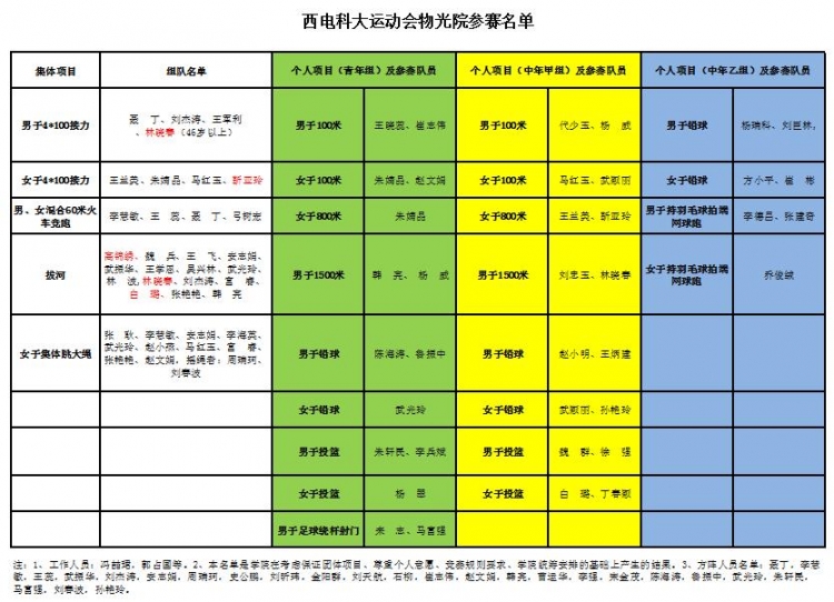 集团工会于4月28日下发了《2015年教职工运动会竞赛规程》,物理与申博sunbet积极响应,并于当日下午召开公司各系室工会组长会议进行了全面动员,同时传达了教职工运动会的竞赛安排、项目分组、竞赛办法等,并对各系室的组织报名、选拔、训练等具体工作做了详细部署。公司各系室报名积极踊跃,各参赛项目的报名人数均超限报名额,经过近一周的队员协商选拔,公司在尊重个人意愿、保证团体项目、争创优良成绩的基础上,最终形成了《西电科大运动会物光院参赛名单》,具体情况如下。