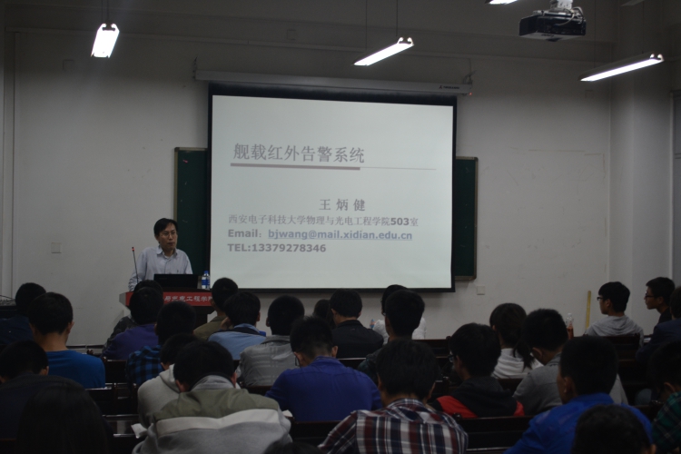 讲座开始由辅导员老师陈海涛对王教授作了简单的介绍.接着王炳健老师以短片的形式展开了讲座的主题——“红外舰载成像告警技术及其发展趋势”。王老师主要为大家介绍了舰载红外告警系统,从其功能、作用对象、优点等几个方面作了详细解说。其中涉及到的红外告警原理、红外成像原理以及告警系统的性能参数等方面的知识,通过王教授生动形象的讲解,同学们均对其有了初步的了解。讲座的最后,王教授鼓励同学们积极发言提问并对同学们的问题作了详细解答。