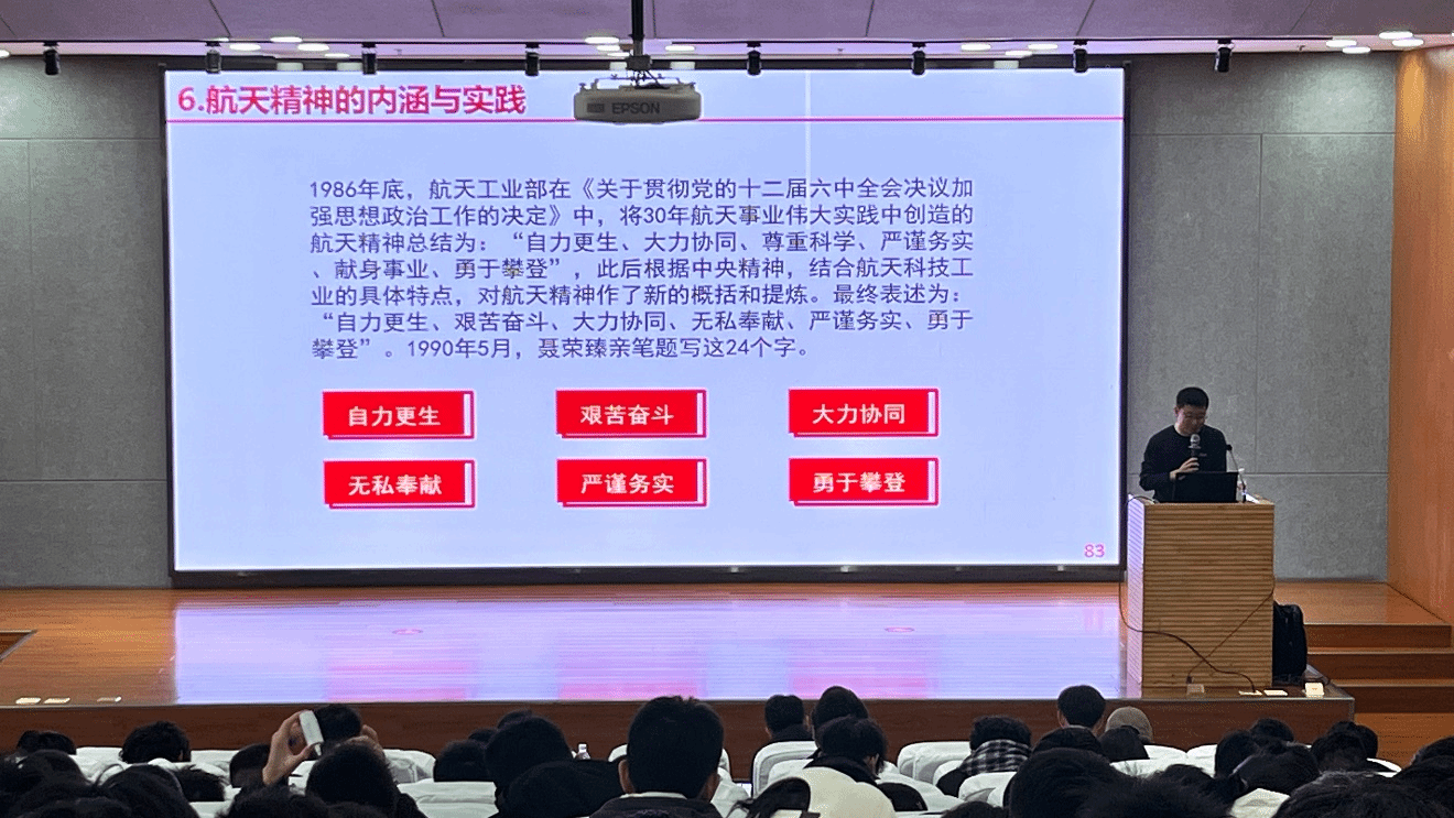 张文睿员工以《从技术追赶到空间引领——我们的卫星激光通信工程》为题作学术报告。他从“我国航天发展简史回顾”“我国人造卫星发展简史回顾”切入,系统梳理中国航天从“两弹一星”到载人航天,从“北斗”组网到“天问”探火的辉煌历程;围绕“卫星激光通信的基本概念和国内外发展历程”展开技术解析,结合自身科研实践,阐释卫星激光通信“高速率、抗干扰、低功耗”的核心优势及未来应用前景。报告中,他多次强调“自力更生、艰苦奋斗、大力协同、无私奉献、严谨务实、勇于攀登”的航天精神,勉励青年学子“将个人理想融入国家发展的星辰大海,以勇气和智慧在航天强国的征程上书写无悔青春!在浩瀚太空镌刻下属于这一代人的中国印记,为实现中华民族伟大复兴的中国梦贡献航天力量”。