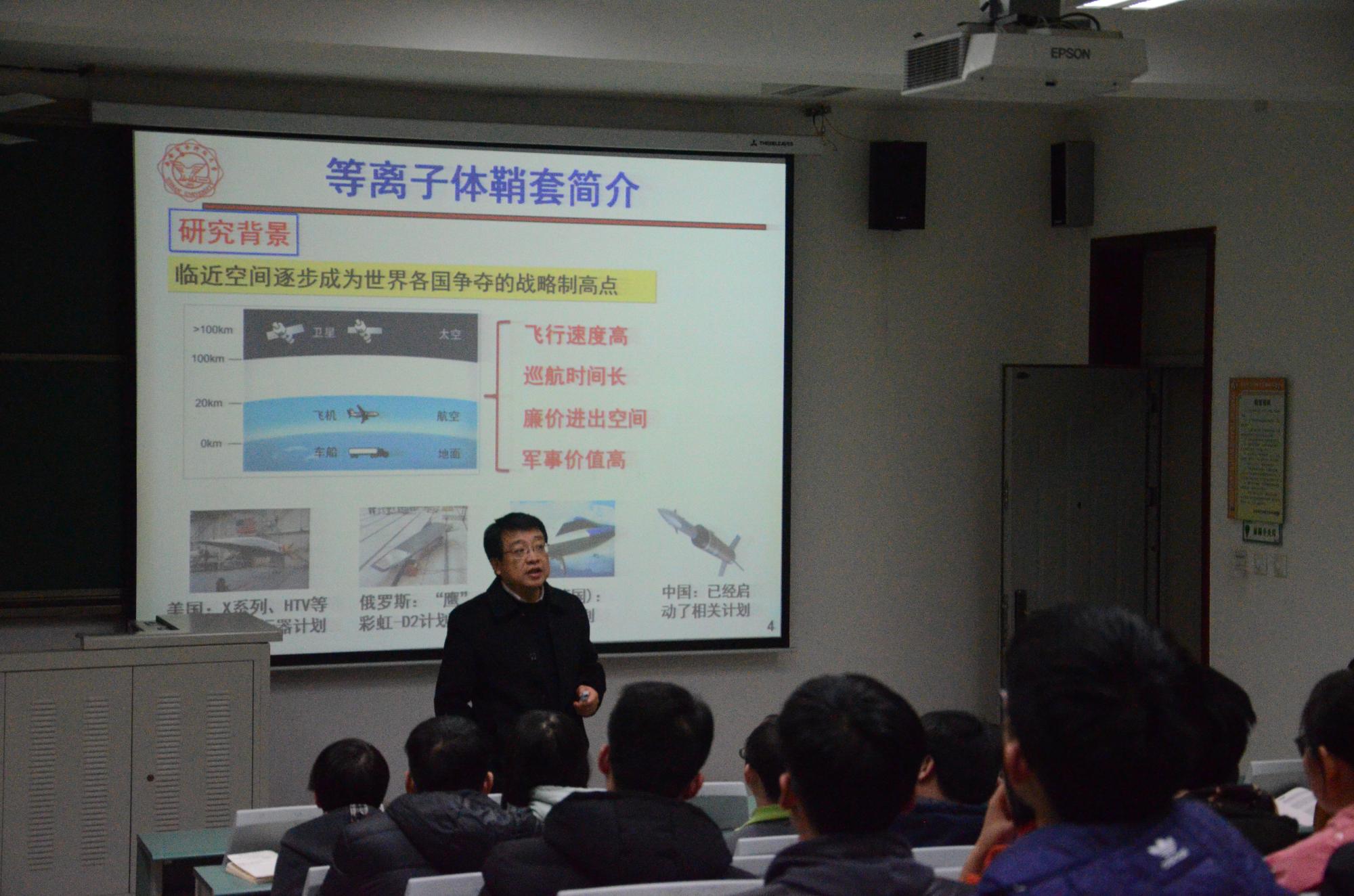 在报告中,郭立新教授谈到,临近空间有着飞行速度高、巡航时间长、使用成本低等特点,已经成为世界各国争夺的重要战略制高点。然而,飞行器的黑障问题并没有得到有效解决,临近空间的真正优势难以发挥,要突破黑障问题的制约,首要基础工作就是高超声速飞行器等离子体鞘套电磁特性研究。随后,他介绍了国内外关于等离子体鞘套电磁特性的研究方法和相关进展,深入剖析了目前研究方法存在的问题,提出了非均匀等离子体“流场特性与电磁计算模型耦合——电波相互作用——电磁散射特性模拟测量——鞘套包覆理论建模与特征分析”及“理论——实验”相互校验的研究体系。郭立新教授重点讲解了课题组在等离子鞘套电磁理论模型和计算方法等方面取得的创新成果,特别围绕高速飞行器电波传播模型和电磁散射模型的建立、天线辐射特性分析及相关工程应用做了详细分析和说明。