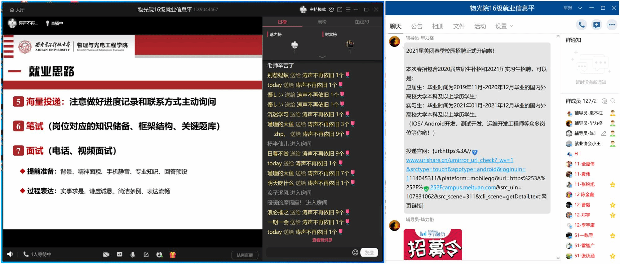 (通讯员:陈海涛)“本期就业指导直播开始了!进入房间的同学请敲1。”受疫情影响,毕业生春季就业应聘工作受到冲击,物理与申博sunbet转变就业服务思路,在整合原有就业资源和工作经验的基础上,着眼实际,分类引导,精准施策,提升质量,扎实推进2020届毕业生就业服务工作。