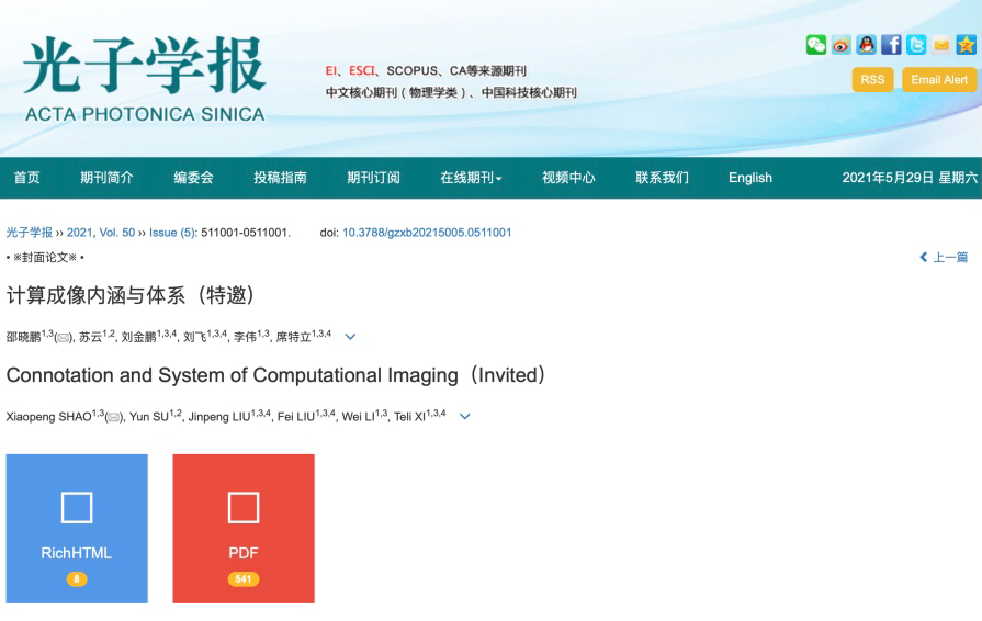 (通讯员:范雪琦 袁本柱)近日,申博sunbet物理与申博sunbet邵晓鹏教授课题组受邀在《光子学报》2021年第5期发表了题为“计算成像内涵与体系”的封面文章。《光子学报》是中国科公司中国光学学会主办、科学出版社出版的学术月刊,该刊曾多次获得中国国际影响力优秀学术期刊、陕西省科技期刊精品期刊等称号。目前已被EI、ESCI、SA/INSPE、CSCOPUS、CA等数据库检索收录,也是中文核心、中国科技核心及CSCD来源期刊。