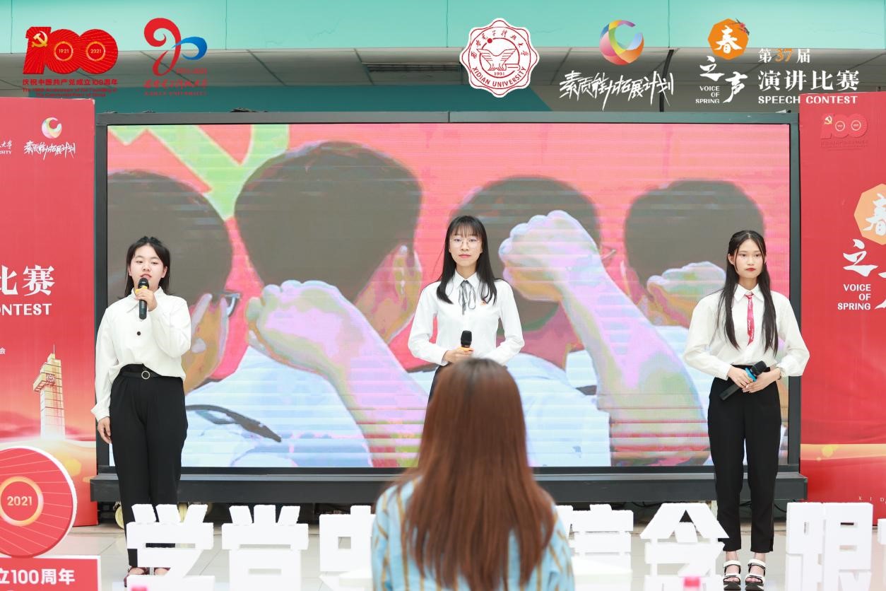 滕智琳、周兴诺、潘晓宇三位同学的演讲《相约第一百个春天》,带着我们展开想象的双翼,回顾百年征途的坎坷崎岖和中华民族一路走向复兴的伟大传奇,让我们共同期待在第一百个春天礼炮声中轰响出满天的惊喜,在第一百个春天交响乐中欢奏出遍地的旋律,共同相约在灿烂的第一百个春天里!