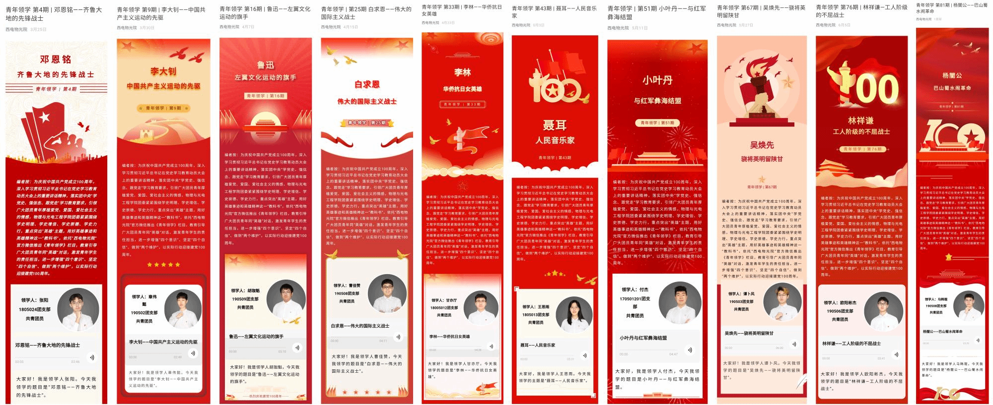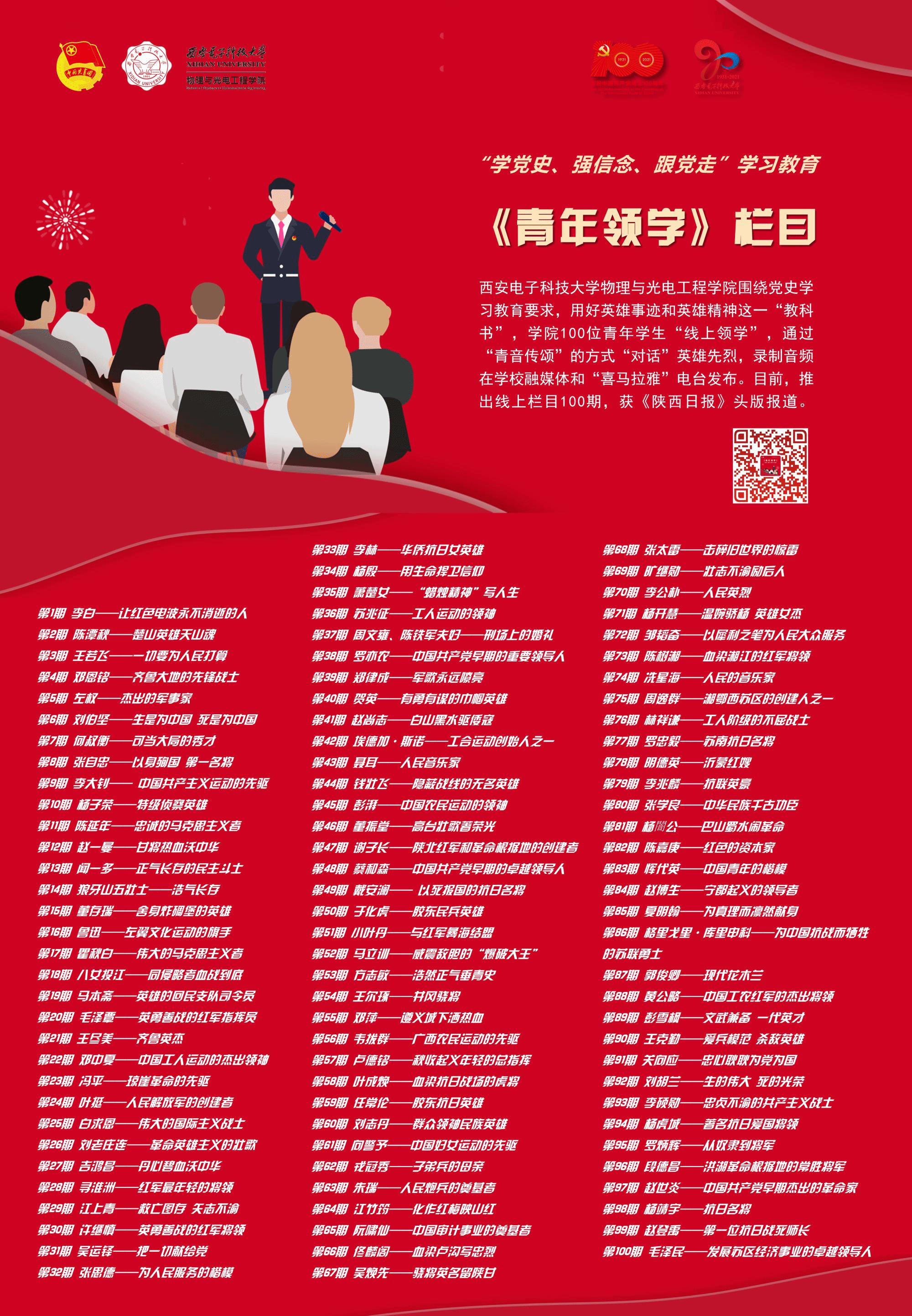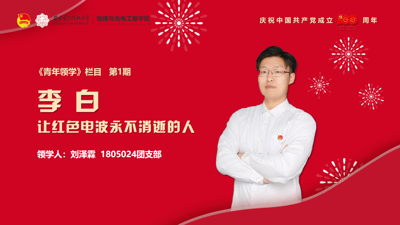 编者按:为庆祝中国共产党成立100周年,深入学习贯彻习近平总书记在党史学习教育动员大会上的重要讲话精神,落实团中央“学党史、强信念、跟党走”学习教育要求,引领广大团员青年厚植爱党、爱国、爱社会主义的情感,物理与申博sunbet紧紧围绕学史明理、学史增信、学史崇德、学史力行,重点突出“英雄”主题,用好英雄事迹和英雄精神这一“教科书”,依托“西电物光院”官方微信和“喜马拉雅FM”电台推出《青年领学》栏目,教育引导广大青年同“英雄”对话,激发青年员工的责任担当,进一步增强“四个意识”、坚定“四个自信”、做到“两个维护”,以实际行动迎接建党100周年。