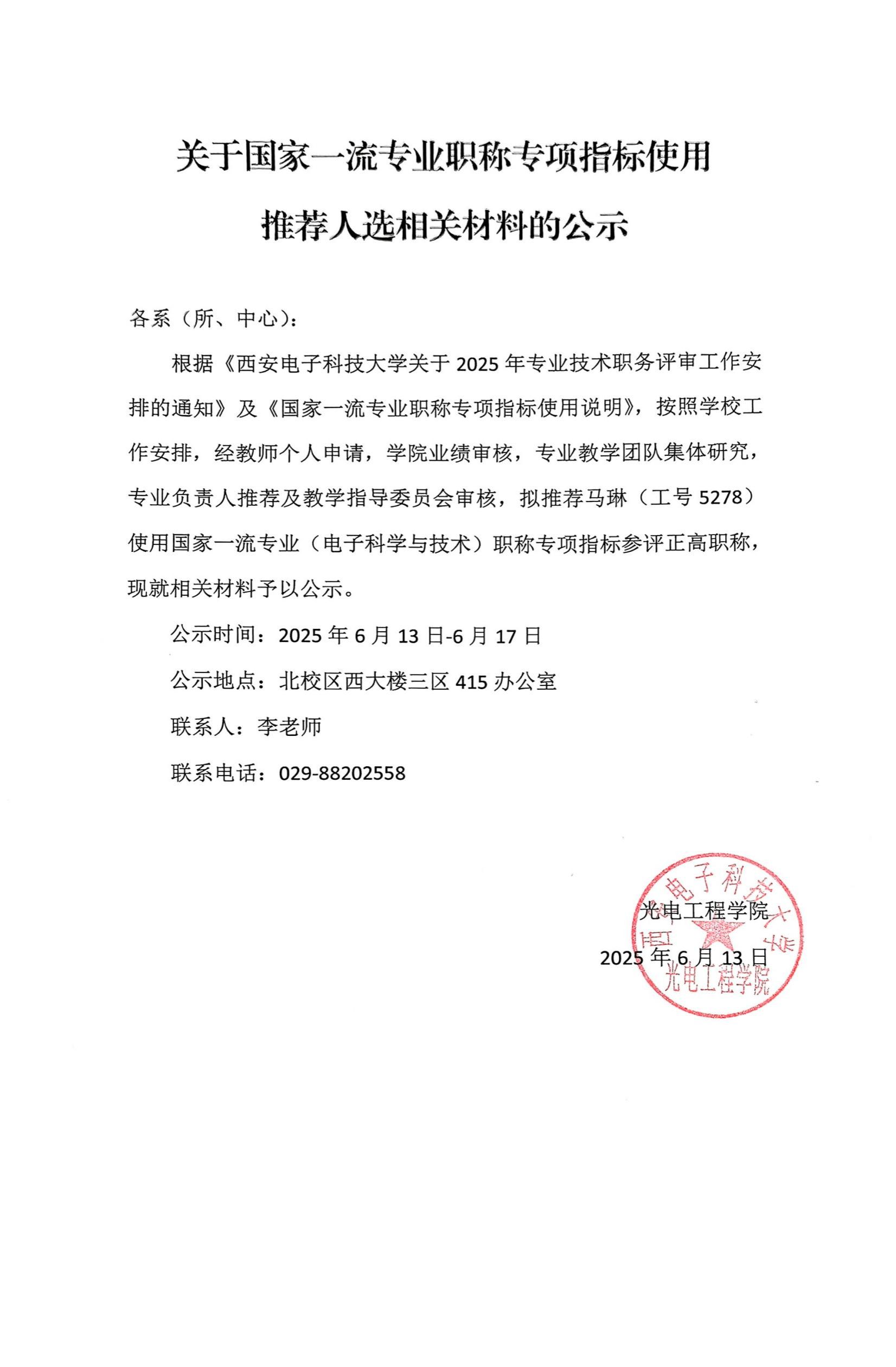 关于国家一流专业职称专项指标使用推荐人选相关材料的公示