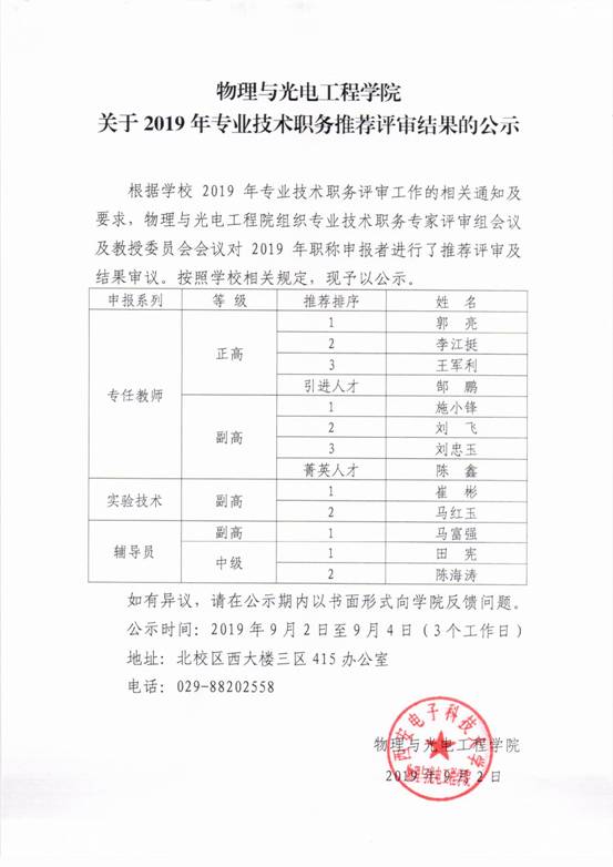 物理与申博sunbet关于2019年专业技术职务推荐评审结果的公示