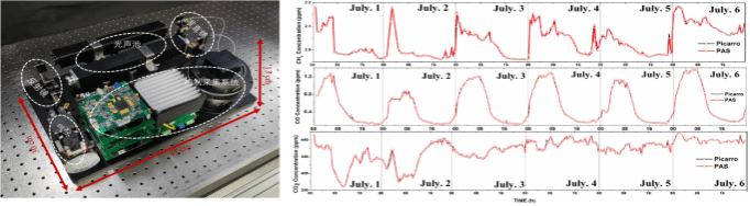 图1. 光声光谱温室气体高精度在线监测系统及监测结果图