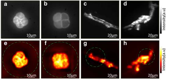 图3 (a-d)复杂荧光目标(无散射介质);(e-h)重建图像。虚线圆圈表示光学记忆效应范围。