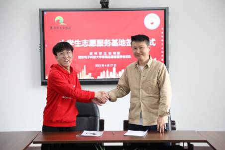 接下来,张熠和刘钢代表春雨志愿者服务队和秦岭野生动物园进行签约。在全体与会人员共同见证下,王纲和刘钢共同为老员工志愿服务基地揭牌。