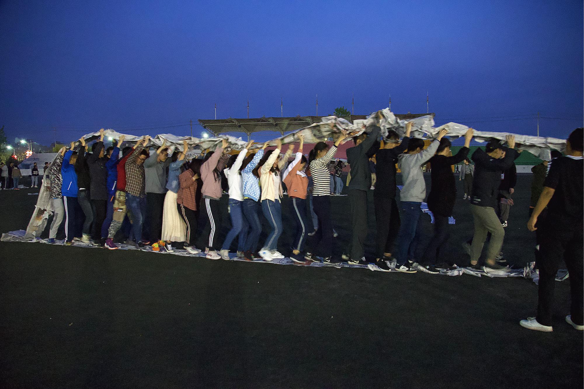 随后,为促进学员相互认识了解,强化团体建设和集体意识,组织部工作人员带领学员分成四组,进行了一系列有趣的破冰活动。具体分为报纸带竞速和穿越呼啦圈两个项目。报纸带竞速为各支队伍站在制作好的报纸履带内行进。穿越呼啦圈则为队员通过身体配合将呼啦圈从右臂套至左臂进而接力传送。现场愉快激烈,学员们积极协作,收获了友谊,凝聚力、归属感也得到了极大的提高。