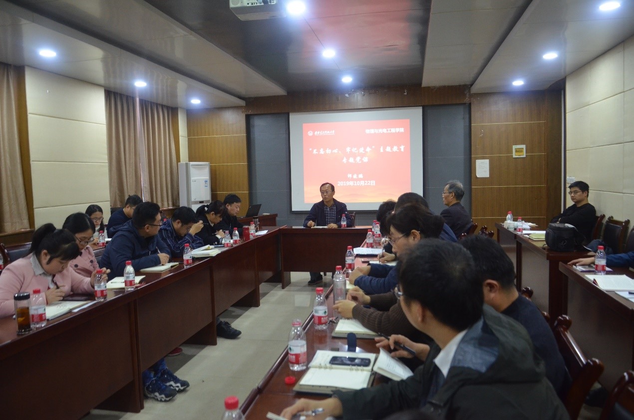 10月22日下午,在北校区西大楼412报告厅,物理与光电工程公司党委举行“不忘初心、牢记使命”主题教育专题党课,公司党委书记独国社、执行经理邵晓鹏主讲,公司两委委员、组织员、系所负责人、教工党支部书记、各党支部党员代表等参加听课,公司主题教育指导组成员宁静参加指导。独国社以“守初心、强党性、担使命、勇作为”为题,结合公司开展“不忘初心、牢记使命”主题教育情况分享了自己的学习体会。在讲对党的初心和使命...